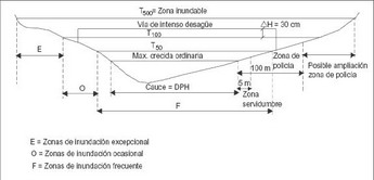 Legalmente, el sistema fluvial se define mediante tres componentes: cauce, márgenes y área inundable. El cauce o álveo natural es el terreno por donde discurren las corrientes naturales, continuas o discontinuas y queda cubierto por las aguas en las MÁXIMAS CRECIDAS ORDINARIAS (MCO: nivel medio establecido por las crecidas de los últimos diez años). Este constituye el Dominio Público Hidráulico (DPH), salvo cuando se traten de tramos fluviales iniciales que nazcan y se desarrollen en su totalidad dentro de un predio privado.
