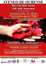 El próximo jueves, 3 de abril tendrá lugar la presentación del libro "La vida es tu lucha. Retrato de nueve mujeres combatientes republicanas", en el Salón de Actos del Ateneo de Ourense a las 19.45 h. El libro del historiador Carlos Fernández Rodríguez que está editado por la Fundación Domingo Malagón, habla de la historia de nueve mujeres republicanas durante la guerra civil, entre ellas la de Concha Carretero, que estará presente en el acto y que a sus 90 años se ha convertido ya en una testigo viva de la historia española. Luchadoraantifascista e histórica militante de la JSU compartió las cárceles del franquismo con algunas de las jóvenes asesinadas en Madrid en el Cementerio del Este el 5 de agosto de 1939 y que para la posteridad serían conocidas como "Las Trece Rosas".